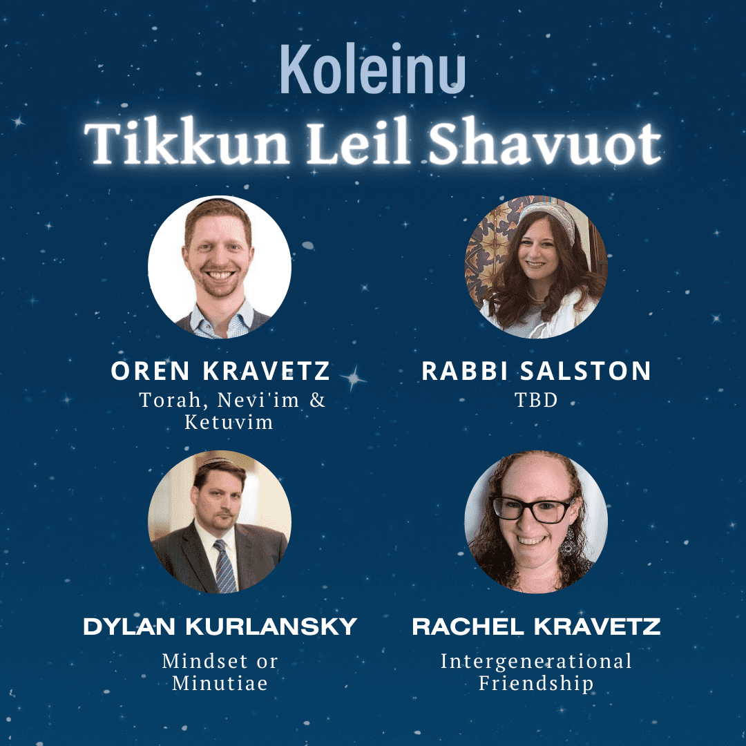 Join us for late night learning on the the eve of Shavuot. Hosted in the Kravetz home, we welcome new and familiar faces to sit and learn together. Here is the schedule: