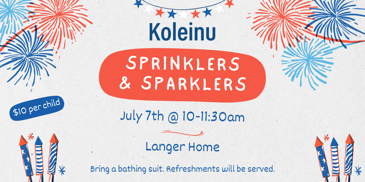 Join your friends at Koleinu to celebrate Independence Day on Sunday, July 7th, from 10am to 11:30am! Bring bathing suits for the sprinklers. Light refreshments will be served.