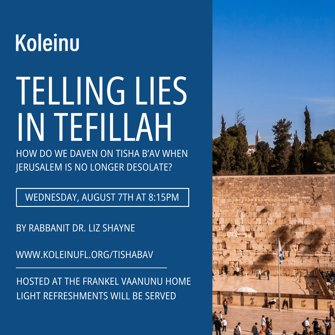 Rabbanit Liz, Koleinu's halachic advisor, will be sharing some words on wisdom in a talk titled "Telling Lies in Tefilah: How do we daven on Tisha B’Av when Jerusalem is no longer desolate?" It will be held on Wednesday evening, August 7th, at 8:15 PM in the Vaanunu Frankel home. Light refreshments will be served.